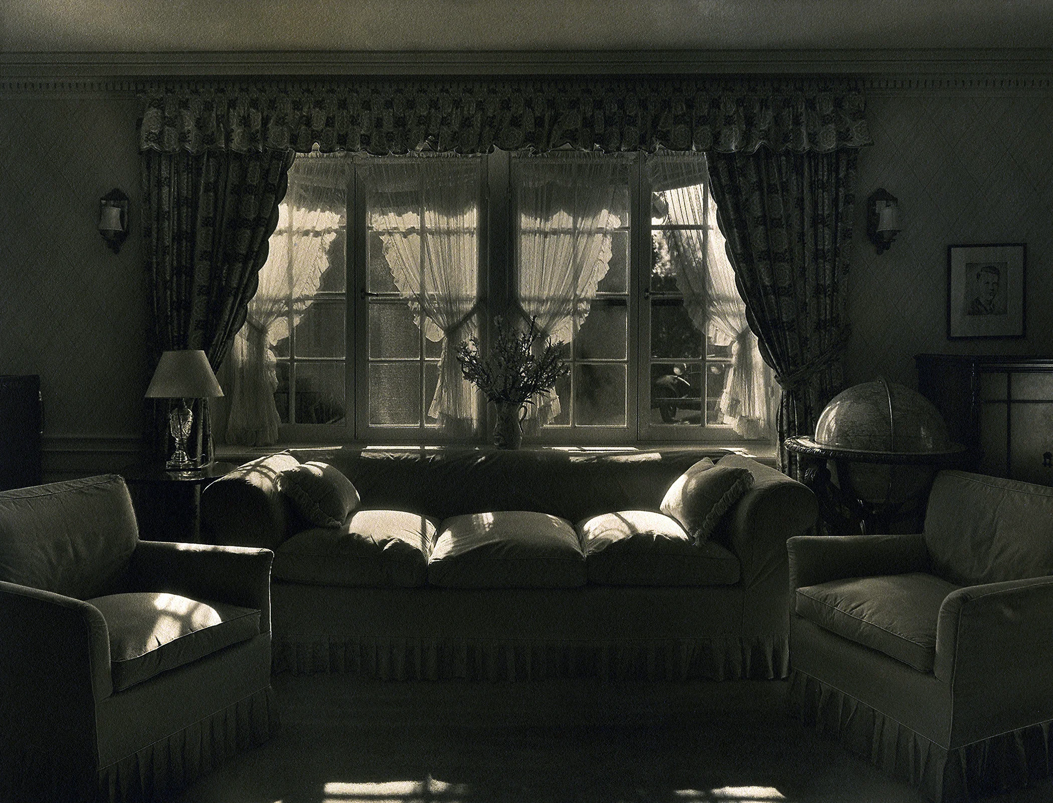 The extraordinary depth of field in this photograph is worth noting, as the automobile sitting outside beyond the window, the shiny mesh of the window screen, and the darkened interior of the room in the foreground are all in perfect focus.